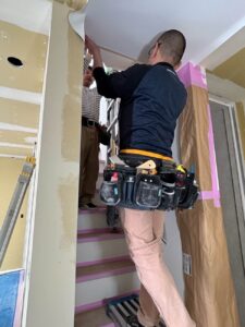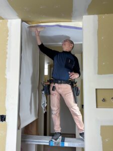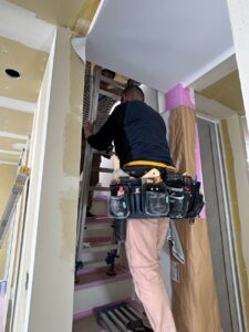 天井~立ち上がりに向けてシートを貼り進めていきます。