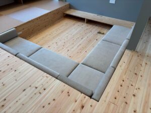 さらに、一段下がったところにあるベンチソファは